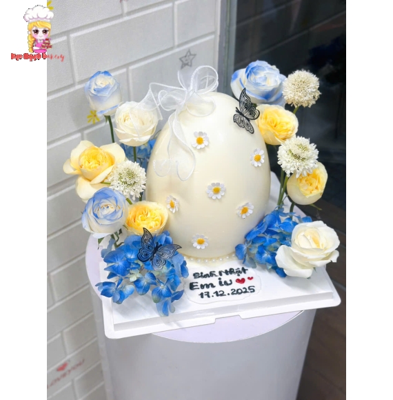 Mẫu bánh trứng đập kết hợp hoa tươi mang đến vẻ đẹp lấp lánh và sang trọng. Hoa tươi được chọn lựa kỹ lưỡng, phối hợp cùng màu sắc kem hài hòa tạo nên tổng thể đầy tính nghệ thuật. Phù hợp để làm quà tặng trong những dịp đặc biệt.