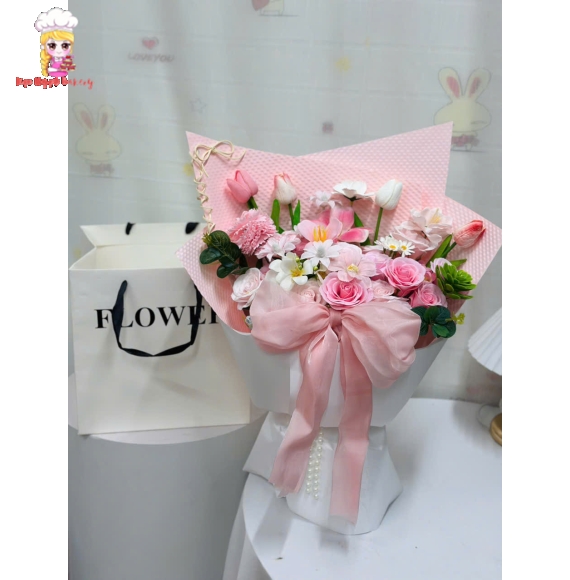 Bó hoa sáp kèm túi giấy tone hồng