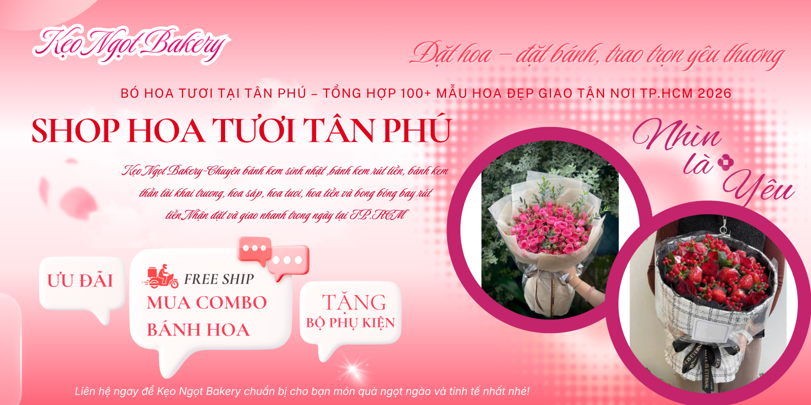 Bó hoa tươi không chỉ là món quà mà còn là cách thể hiện cảm xúc tinh tế và gu thẩm mỹ của người tặng. Với hơn 100+ mẫu hoa đa dạng, từ phong cách Hàn Quốc đến hiện đại, Kẹo Ngọt Bakery chính là địa chỉ lý tưởng nếu bạn đang tìm kiếm bó hoa tươi tại Tân Phú đẹp, chất lượng và giao nhanh tại TP.HCM.