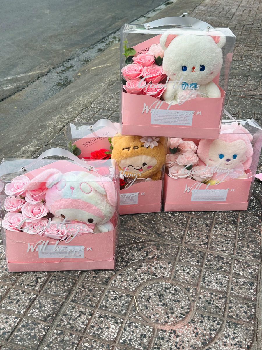 Hoa gấu bông mix hoa sáp kèm hộp quà
