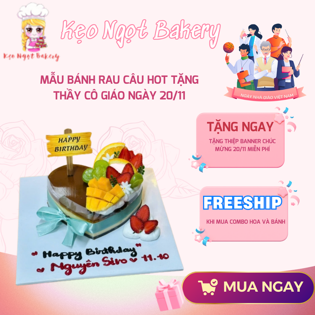 Ngày 20/11 hàng năm là dịp đặc biệt để học sinh thể hiện lòng biết ơn đến các thầy cô giáo – những người đã dạy dỗ và dẫn dắt chúng ta trên con đường tri thức. Trong những năm gần đây, bánh rau câu nghệ thuật trở thành món quà độc đáo, tinh tế, được nhiều học sinh, phụ huynh và tập thể trường lựa chọn để tri ân thầy cô. Tại Kẹo Ngọt Bakery, các mẫu bánh rau câu hot nhất năm 2025 được thiết kế đa dạng, vừa đẹp mắt, vừa mang thông điệp ý nghĩa, hoàn hảo cho ngày lễ đặc biệt này.