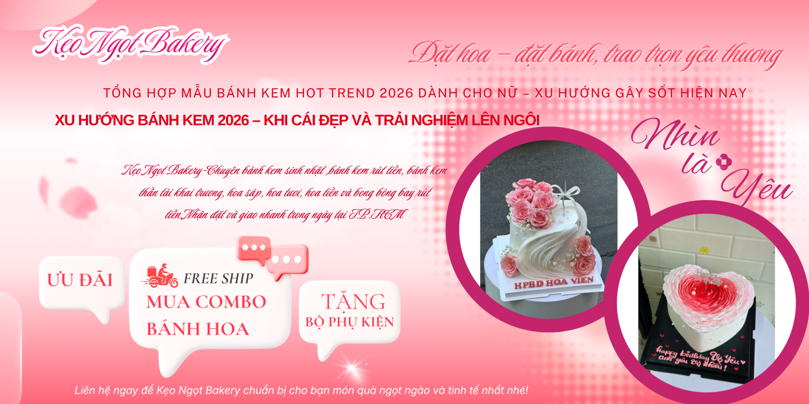 Các mẫu bánh kem hot trend 2026 dành cho nữ không chỉ đẹp mà còn mang lại trải nghiệm mới mẻ, phù hợp với xu hướng hiện đại. Với sự đa dạng về thiết kế và khả năng cá nhân hóa, Kẹo Ngọt Bakery là địa chỉ lý tưởng để bạn lựa chọn những chiếc bánh ấn tượng cho các dịp đặc biệt.