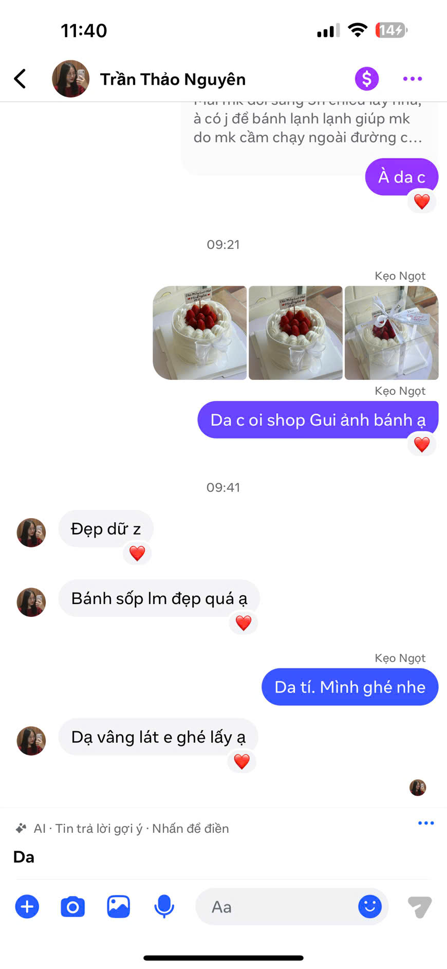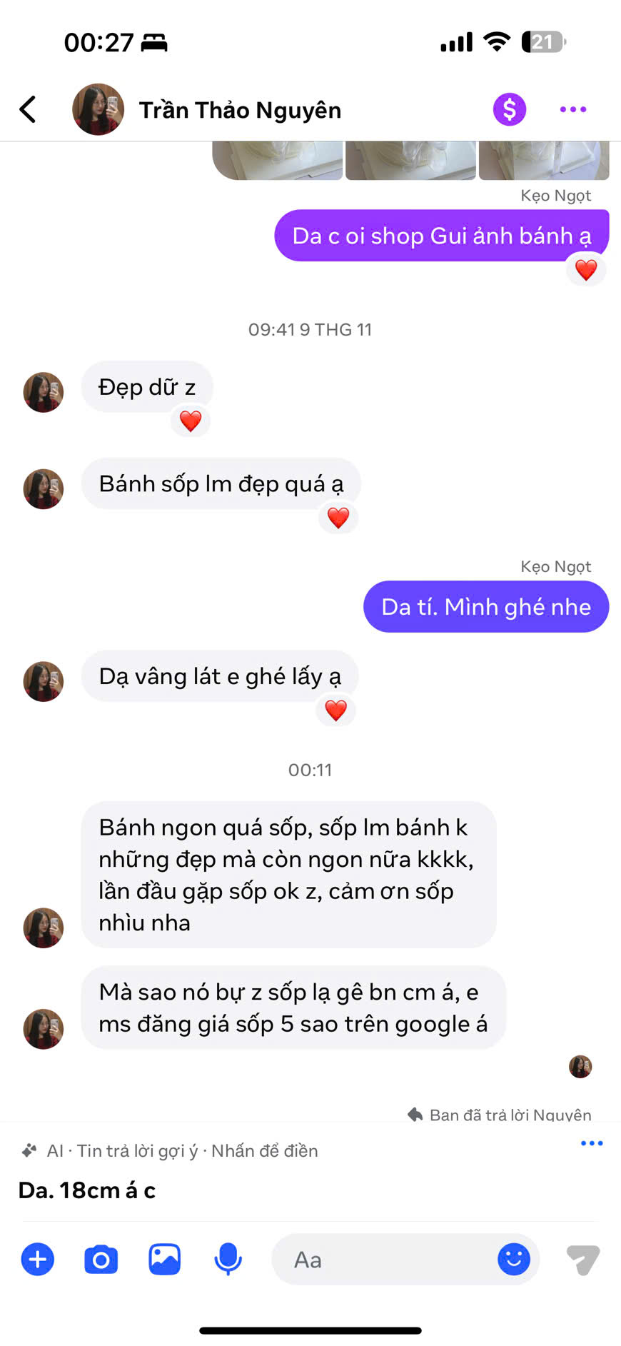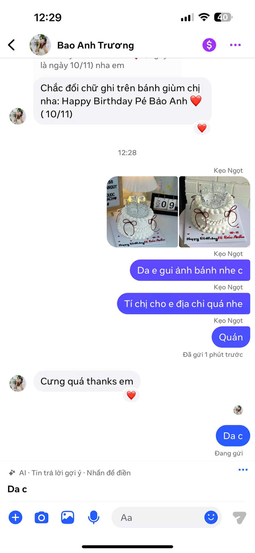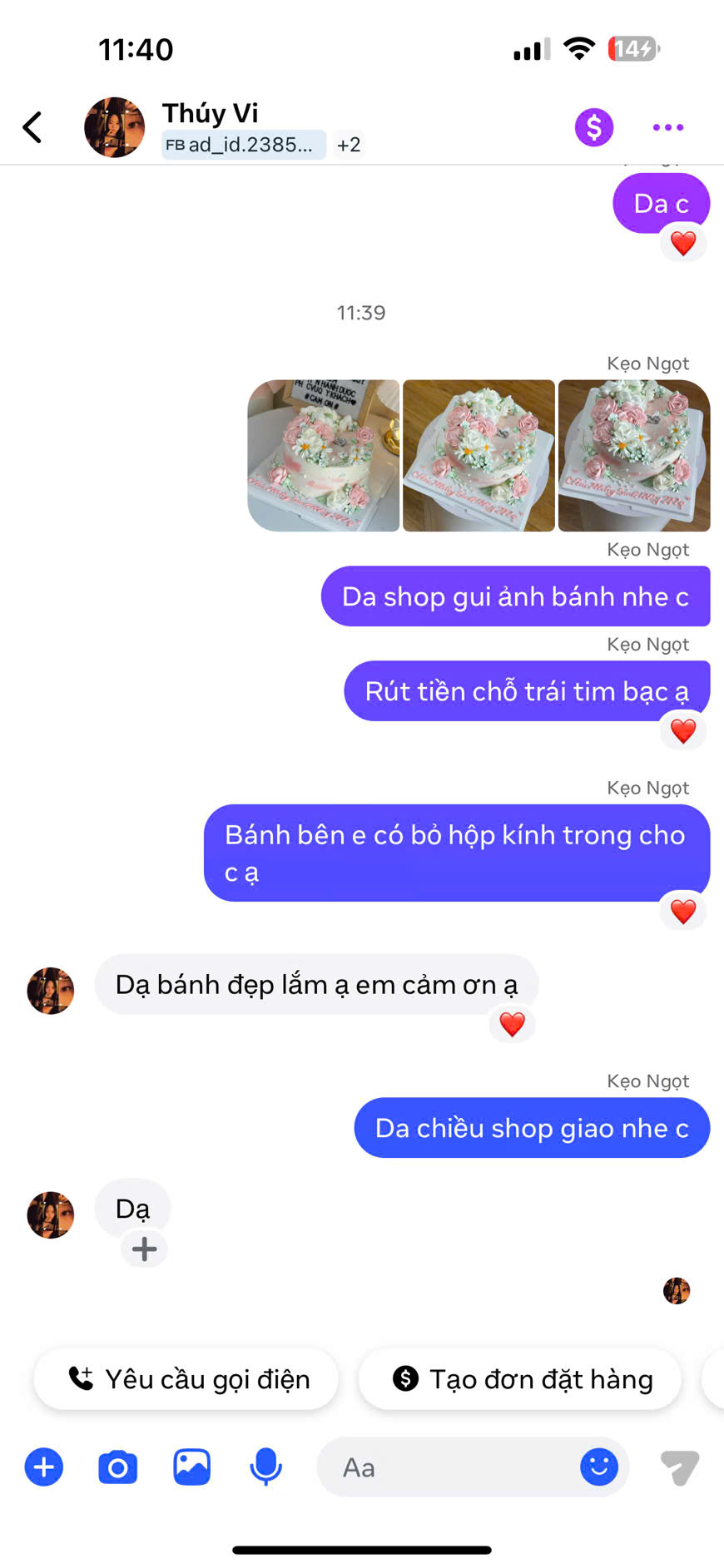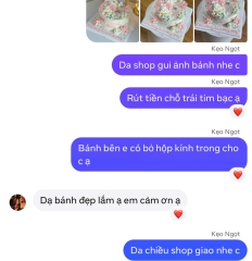 Tại Kẹo Ngọt Bakery, mỗi chiếc bánh không chỉ là một món ăn ngon mà còn là sự gửi gắm tình cảm, niềm vui và bất ngờ đến người nhận. Chúng tôi rất hạnh phúc khi liên tục nhận được những phản hồi chân thành từ khách hàng sau khi trải nghiệm dịch vụ.Feedback Khách Hàng – Kẹo Ngọt Bakery Luôn Làm Hài Lòng Người Nhận Tại Kẹo Ngọt Bakery, mỗi chiếc bánh không chỉ là một món ăn ngon mà còn là sự gửi gắm tình cảm, niềm vui và bất ngờ đến người nhận. Chúng tôi rất hạnh phúc khi liên tục nhận được những phản hồi chân thành từ khách hàng sau khi trải nghiệm dịch vụ. Khách Hàng Nói Gì Về Bánh Kem Rút Tiền? Một trong những mẫu bánh “gây sốt” tại tiệm chính là bánh kem rút tiền. Nhiều khách hàng chia sẻ rằng: Chiếc bánh vừa ngon vừa độc đáo, khiến buổi tiệc thêm phần thú vị. Người nhận bất ngờ, không ngừng nở nụ cười khi kéo từng tờ tiền từ chiếc bánh xinh xắn. Đây không chỉ là một chiếc bánh, mà còn là món quà ý nghĩa và đáng nhớ. Hoa Sáp – Hoa Tiền – Quà Tặng Song Hành Cùng Bánh Kem Ngoài bánh kem, nhiều khách hàng lựa chọn thêm hoa sáp hoặc hoa tiền đi kèm. Bộ đôi này vừa tinh tế, vừa sang trọng, lại mang thông điệp yêu thương bền lâu. Khách hàng đánh giá cao sự khéo léo trong cách phối màu, tạo hình hoa và sự tinh tế trong từng chi tiết. Dịch Vụ Chu Đáo – Khách Hàng Hoàn Toàn Hài Lòng Không chỉ dừng lại ở sản phẩm, dịch vụ tại Kẹo Ngọt Bakery cũng được nhiều khách khen ngợi: Giao hàng nhanh chóng, đúng hẹn, luôn đảm bảo bánh và hoa còn nguyên vẹn, đẹp mắt. Hỗ trợ thiết kế riêng theo yêu cầu của từng khách hàng, từ màu sắc, thông điệp đến kiểu dáng bánh. Ưu đãi hấp dẫn: free ship combo bánh + hoa, tặng kèm thiệp và banner chúc mừng riêng. Lời Cảm Ơn Từ Kẹo Ngọt Bakery Chúng tôi xin chân thành cảm ơn quý khách hàng đã tin tưởng và lựa chọn Kẹo Ngọt Bakery trong những dịp đặc biệt. Mỗi feedback là động lực để chúng tôi không ngừng sáng tạo, mang đến những mẫu bánh và món quà tinh tế hơn nữa. 📍 Địa chỉ: 23 Gò Dầu, P. Tân Quý, Q. Tân Phú, TP.HCM 📞 Hotline: 0796 847 798 – 0357 191 274 🌐 Website: keongotbakery.com