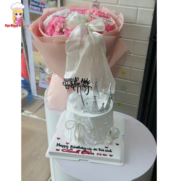Combo bánh kem thổi kim tuyến với hoa sáp tone hồng