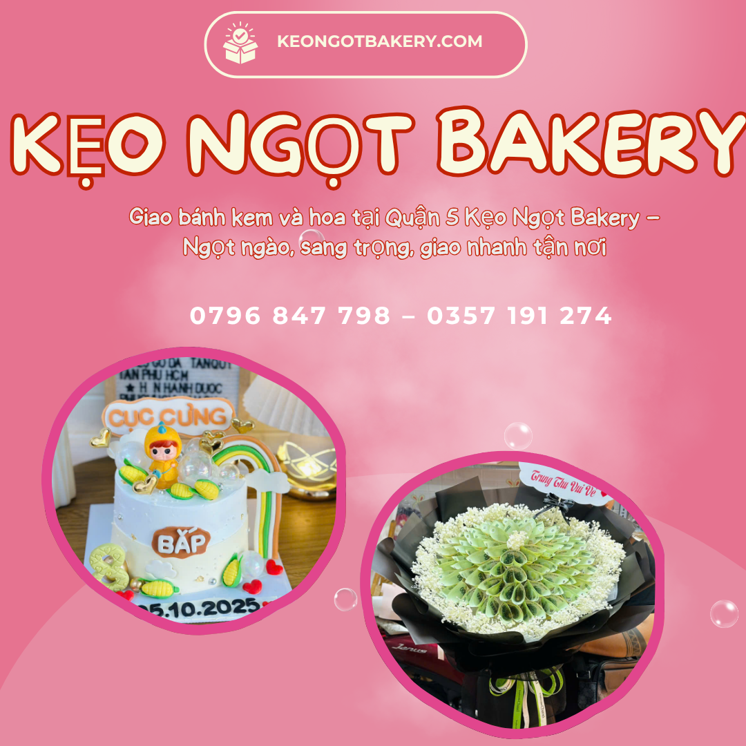 Với phong cách làm việc tận tâm và chuyên nghiệp, Kẹo Ngọt Bakery đã trở thành địa chỉ tin cậy cho khách hàng tại Quận 5 khi cần đặt bánh kem và hoa tươi.Mỗi sản phẩm được gửi đi đều mang trong mình thông điệp yêu thương, niềm vui và sự chỉn chu đến từng chi tiết.Hãy để Kẹo Ngọt Bakery đồng hành cùng bạn trong mọi dịp đặc biệt – giao nhanh, bánh đẹp, hoa tươi, chất lượng vượt mong đợi.