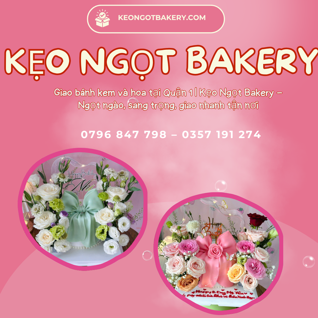 Khi nhắc đến tiệm bánh kem ngon ở Quận 1, nhiều khách hàng sẽ nghĩ ngay đến Kẹo Ngọt Bakery – một thương hiệu chuyên về bánh sinh nhật, bánh rút tiền, bánh mousse, tiramisu và quà tặng kết hợp hoa tiền – hoa sáp độc đáo.Tiệm bánh không chỉ nổi tiếng bởi hương vị thơm ngon, mềm mịn mà còn bởi cách trang trí ấn tượng, cập nhật xu hướng mới nhất. Dù bạn cần chiếc bánh đơn giản dành cho gia đình, hay mẫu bánh cầu kỳ cho tiệc sinh nhật, kỷ niệm, Kẹo Ngọt Bakery đều có thể đáp ứng.Đặc biệt, dịch vụ giao bánh nhanh tại Quận 1 chỉ trong 2 giờ giúp khách hàng yên tâm đặt bánh gấp, không lo trễ hẹn.